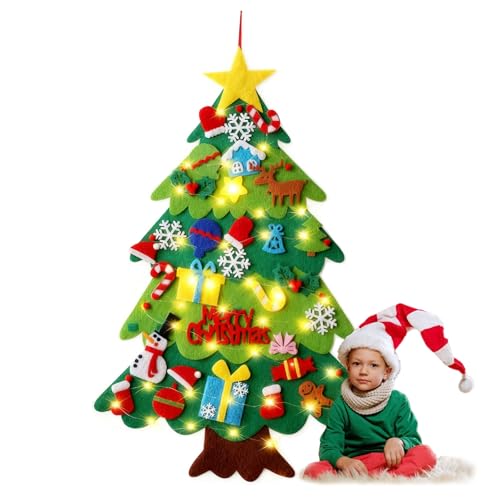 Ensemble de sapin de Noël en feutre pour tout-petits et enfants avec guirlande lumineuse LED de 3 m, 1 m à suspendre au mur, sapin de Noël à faire soi-même avec 32 décorations amovibles pour décoration de Noël de la maison