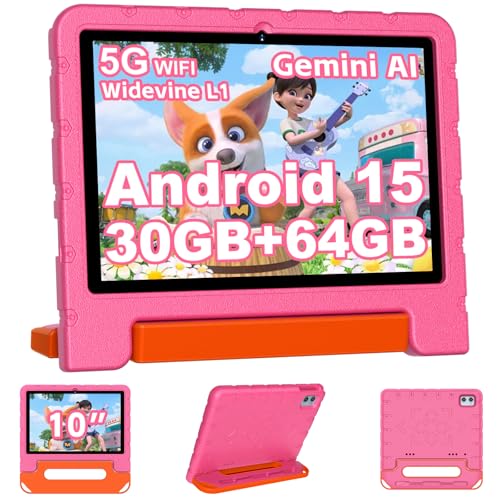 Kidoz Tablette Android 10,1" avec étui pour enfants, 4 (2+2) Go de RAM 64 Go de ROM, 5000 mAh, 1280 x 800, double caméra, WiFi, Kidoz pré-installé, contrôle parental, Android 13, rose