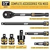 - Complete 65-Piece Set: Includes SAE (Deep and shallow) socket: 3/8, 7/16, 1/2, 9/16, 5/8, 11/16, 3/4, 13/16, 7/8, 15/16, 1, 1-1/16, 1-1/8 to 1-1/4"; metric (Deep and shallow) socket: 10, 11, 12, 13, 14, 15, 16, 17, 18, 19, 20, 21, 22, 23, 24mm. Additionally, it comes with 3 extension bars (3, 5, 10-inch), 1 x quick-release 72-tooth ratchet handle, 1 x 1/2" impact universal joint, 1 x 1/2" (F) to 3/8" (M) reducer, and 1 x 3/8" (F) to 1/2" (M) adapter