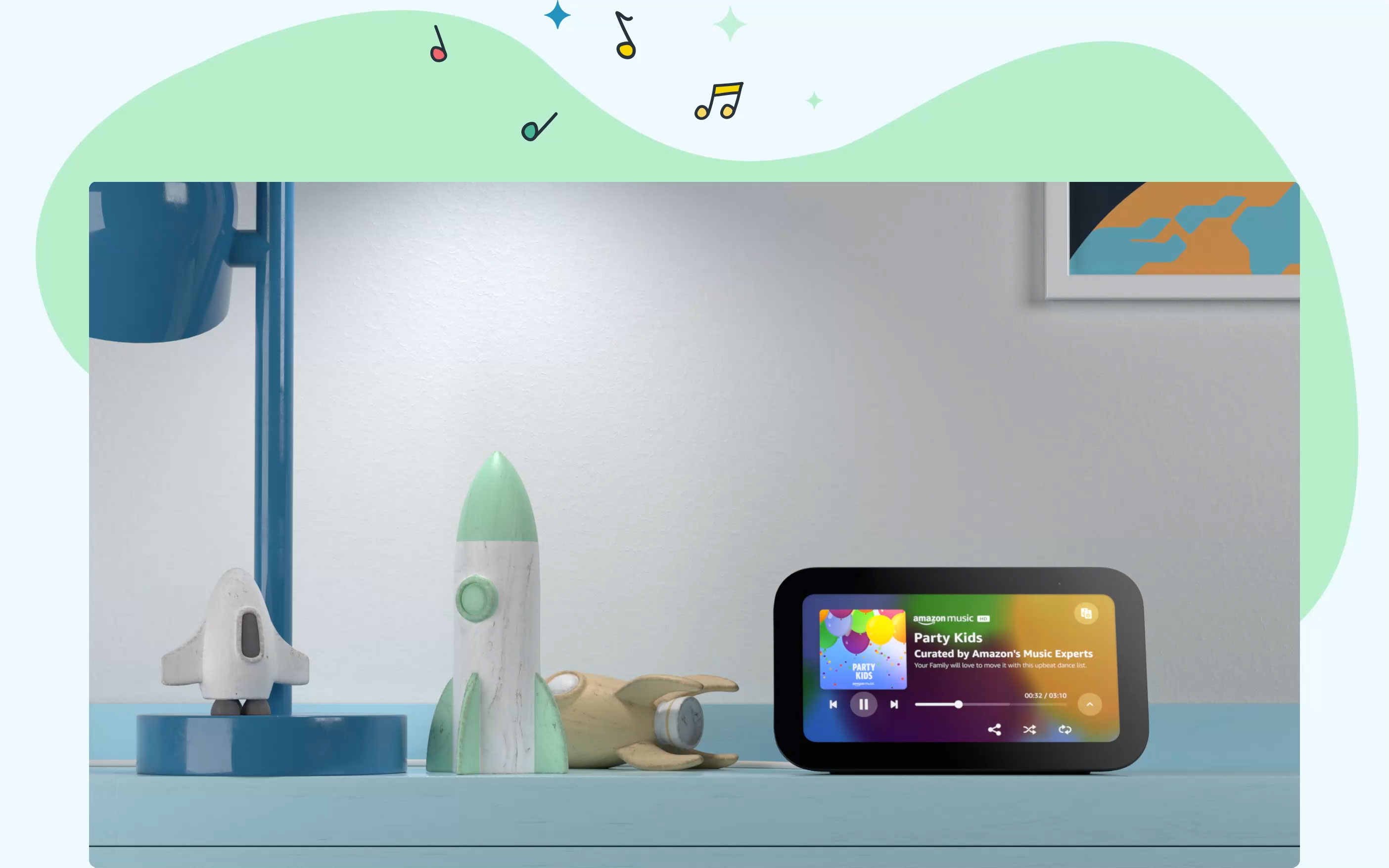 - Bigger sound for big imaginations – Kids can ask Alexa to play music, read a bedtime story, get help with their homework, and more. Stream songs from 鶹 Music, Apple Music, Spotify, and more.