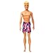 - Ken doll wears sun-sational fabric swim trunks with cool purple graphics.