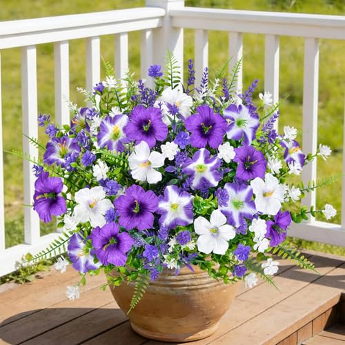 Artificial Fake Flowers Plants for Outdoor Decoration, 2PCS Faux Petunias Silk Flower UV Resistant No Fade Floral for Home Outside Garden Balcony Yard Porch Realistic Indoor Decor (Purple White)