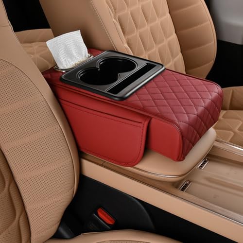 Multifunctional Pu Leather Car Armrest Box Mat, Car Tissue Box Holder with Cup Holder & Cars Tissue Holder Universal Arm Rest Cover for Front Rear Seats Yacht Central Console (Burgundy)