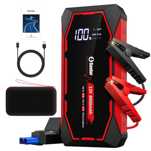 9-in-1 5000A 150PSI Car Battery Booster Jump Starter with Air Compressor (All Gas/9L Diesel), Portable Car Battery Booster Pack, Safe Durable Car Jump Starter with Extended Jumper Cables, Glove, Light