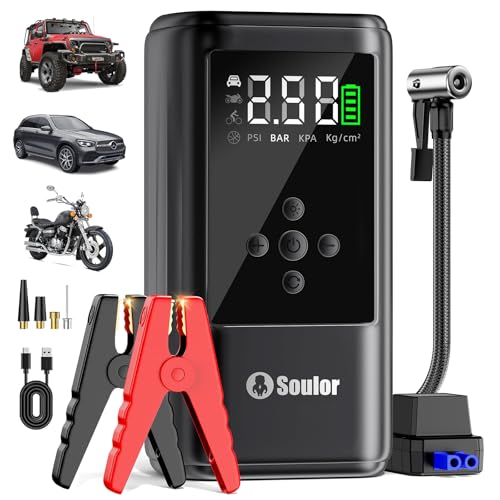 6000A Jump Starter with Air Compressor, 150PSI Portable Car Battery Booster Pack (Up to 10.0L Gas / 8.0L Diesel Engines), 12V Jump Box with LCD Display, LED Light & Power Bank
