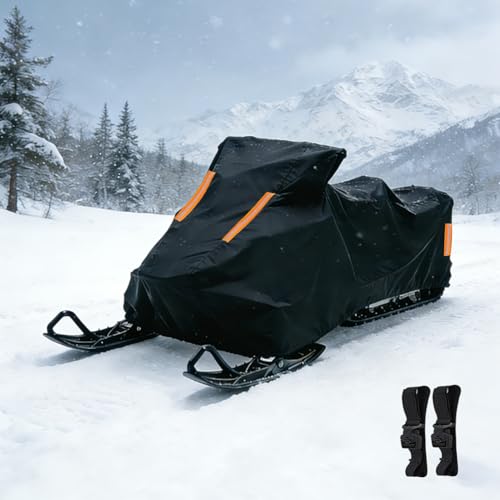 AUTOLION Waterproof Snowmobile Cover, Compatible with Polaris Ski Doo Arctic Cat Yamaha, Windproof Snowshield Cover with Windproof Buckles (145''L 脳 51''W 脳 48''H) Black and Orange