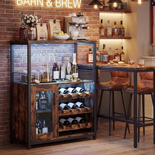 Garvee Rustic Brown Wine and Coffee Bar Cabinet with LED Light, Adjustable Shelves, Mesh Door, and Baffle Design, 36" Liquor Storage Cabinet for Home, Kitchen, Dining Room