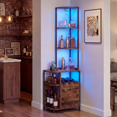TackView Corner Bar Cabinet with LED Strip & Glass Holder,5-Tier Rustic Brown Liquor & Wine Storage, Adjustable Shelf for Home Kitchen, Living Room