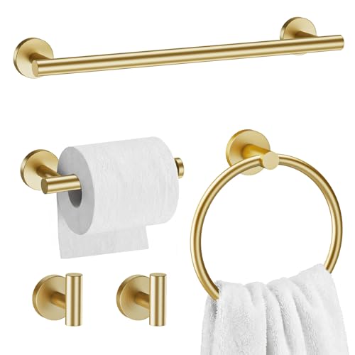 TocTen Bathroom Hardware Set SUS304 Stainless Steel-Towel Rack Set Include Hand Towel Bar+Toilet Paper Holder+3 Robe Towel Hooks Bathroom Accessories Towel Bar Set (Brushed Gold, 5 Pcs 16 Inch)