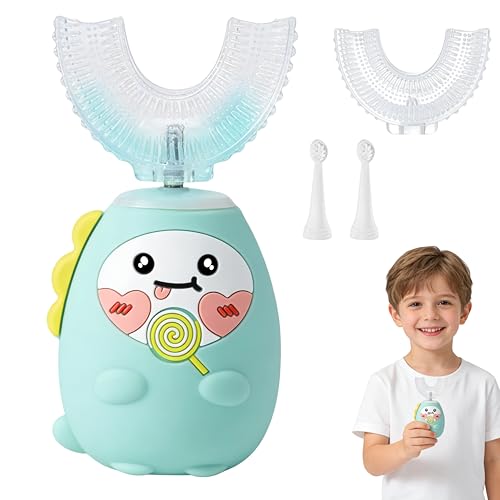 Kids Electric U Shaped Toothbrush, 360潞 Round Automatic Toothbrush Kids with 4 Brush Heads, Smart Timer & 3 Cleaning Modes, IPX7 Waterproof Toddler Electric Toothbrush(Green Cartoon Dinosaur Ages 2-12)