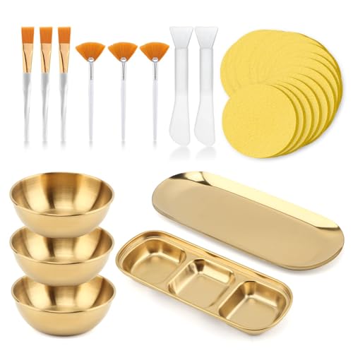 18pcs Esthetician Facial Supplies Set, Including 6 Gold Stainless Steel Bowls, 6 Fan Brushes & 6 Flat Brushes Face Mask Applicator Facial Mask Mixing Bowl Set Essential Tool for Women Spa (Gold)