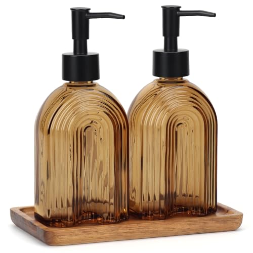 14 Oz Black Pump Glass Soap Dispenser, Transparent Stripe Countertop Refillable Liquid Bottle Hand Dish Lotion Dispenser with Plastic Pump, for Kitchen, Bathroom