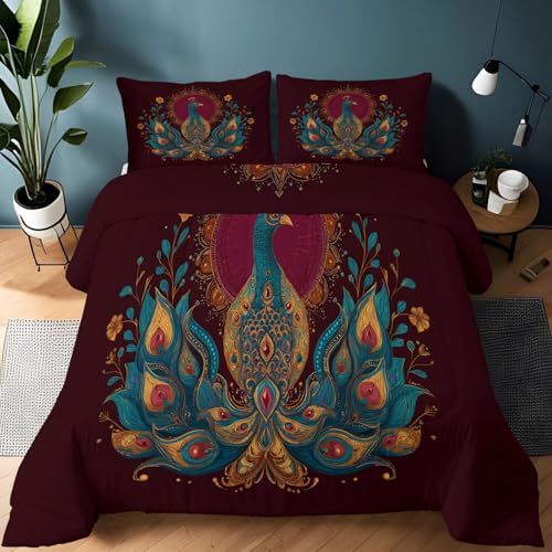 Wake In Cloud - Rustic Comforter Set, Cabin Christmas Farmhouse Western Lodge Woodland Wildlife Patchwork RV Outdoor Theme, Soft Lightweight Bedding, 3-Piece, Burgundy Black, Queen Size