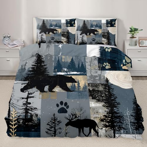 Wake In Cloud - Rustic Duvet Cover Set, Camping Christmas Farmhouse Western Patchwork Plaid Holiday Lodge Cabin RV Outdoor Wildlife Theme Bedding, 3-Piece, Burgundy Black, Queen Size