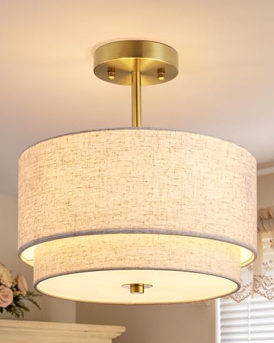 16" Double Drum 3-Light Semi Flush Mount Ceiling Light, Classic Fabric Linen Shade Design for Living Room, Bedroom, Kitchen, Dining Room, Hallway and Entryway
