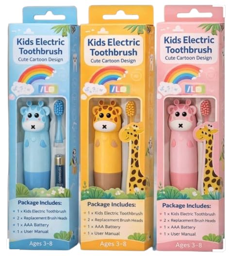 Kids Electric Toothbrush with Cute Cartoon Design, Multi-Color Light Function, Ages 3-8, Includes 2 Replacement Brush Heads and AAA Battery, Battery-Operated (Blue)