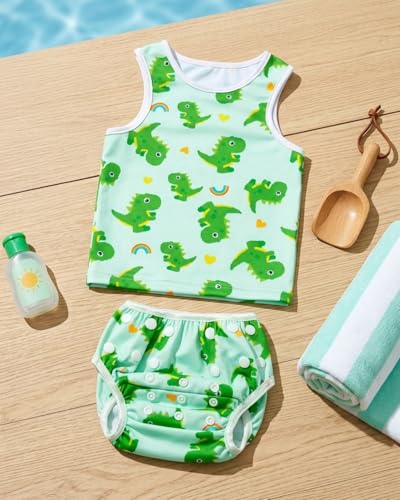 WAWSAM Baby Boys Swimsuit Set Dinosaur Toddler Swimming Rash Guard Two Pieces Trunk Short Sleeve Swimwear Set