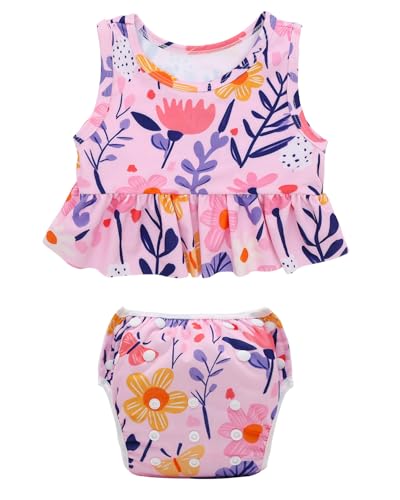 ALVA ALVABABY 2 Pieces Baby Girls Swimsuit Toddler Rash Guard Set Short Sleeve Swimwear Reusable Swim Diaper with Matching Top 2T