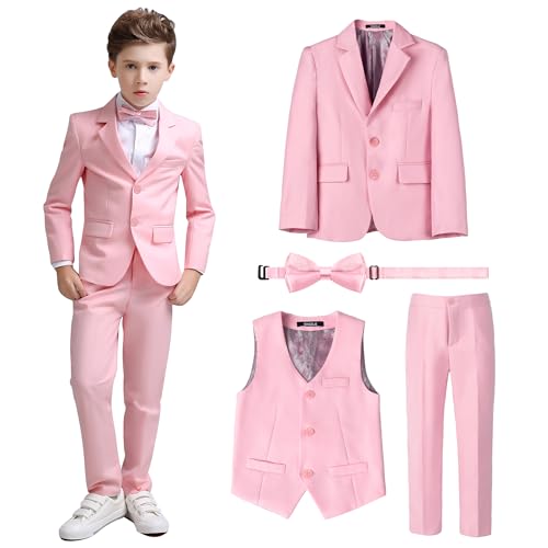 DANUOKU Boys Formal Suit Set with Vest, Pants, Shirt and Bow Tie,Wedding Ring Bearer Outfits for 4-14 Years