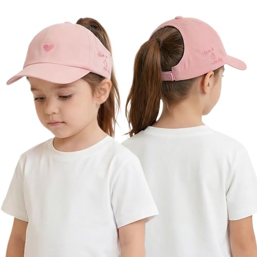 Girls Ponytail Baseball Cap Cute Heart Embroidered Outdoor Casual Trucker Hat Kids Summer Adjustable Sun Hat for 2-7 Years