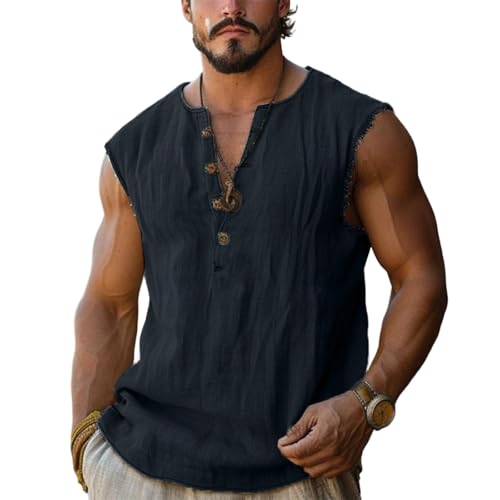 Men's Cotton Linen Tank Tops Sleeveless Henley Shirts Summer Beach Casual Button Up Blouses Undershirts
