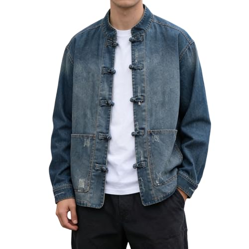 Men鈥檚 Chinese Style Denim Jacket Mandarin Collar Frog Button Long Sleeve Jean Coat Casual Hip Hop Vintage Jackets