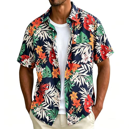 Mens Hawaiian Shirt Short Sleeve Collared Button Down Tops Tropical Floral Novelty Print T-Shirt Summer Vacation Beach Shirts