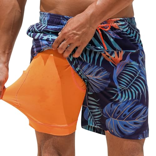 XYKJFIT Mens Swim Trunks with Compression Liner 5" Drawstring Beach Shorts for Men Quick Dry Zipper Pockets Board Short S-XL