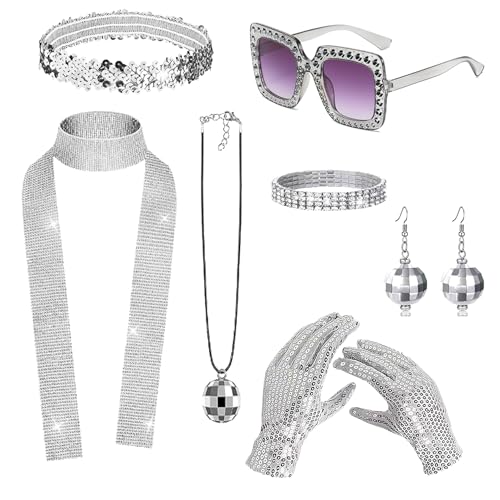 6 Pcs 70s Disco Accessories Women Disco Costume Jewelry Disco Sequin Scarf Headband Diamond Bracelet Ball Necklace Earring Glasses