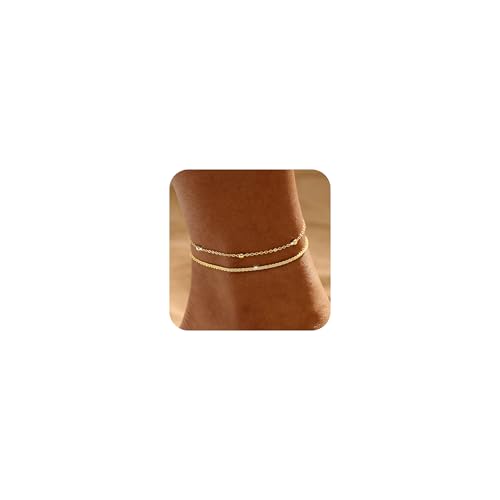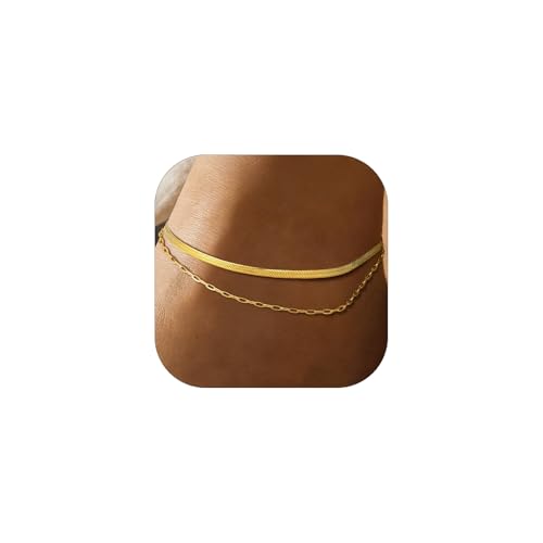 FOCALOOK Anklets Bracelet for Women 14K Gold Plated Waterproof Mariner Cuban Flat Snake Chain Anklet Summer Beach Jewelry 22-27cm Adjustable