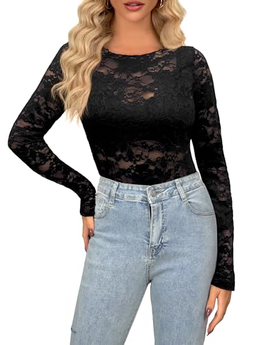 Zeagoo Long Sleeve Shirts for Women Floral Mesh Sheer Top Mock Neck Double Lined Fitted Going Out Blouses