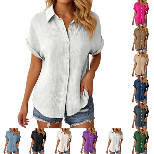 Sdipipo Womens Summer Cotton Linen Short Sleeve Button Down Shirt Collared V-Neck Loose Fit Blouse Beach Office Tops