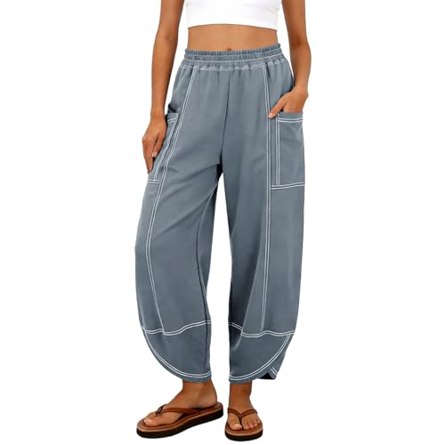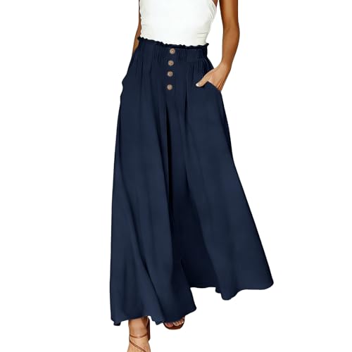 Women Cotton Linen Palazzo Pants High Smocked Waisted Drawstring Wide Leg Pant Pleated Lounge Trousers with Pockets