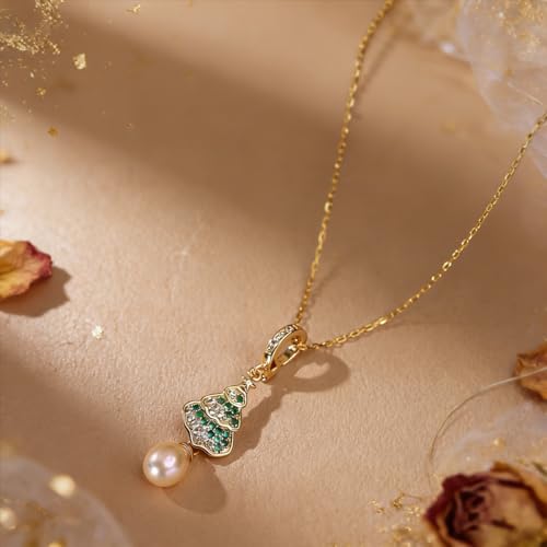 6-7mm natural freshwater pearl, 18K gold plating, hypoallergenic for sensitive skin. Festive Christmas tree design with emerald & crystal accents. Perfect for weddings, holidays, and gifting. Comes in