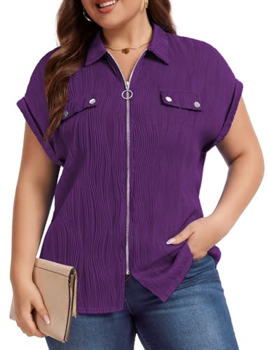 Zamowoty Womens Plus Size Tops Summer Short Sleeve Zip Front V Neck Collar Shirts Dressy Causal Work Office Loose Blouses