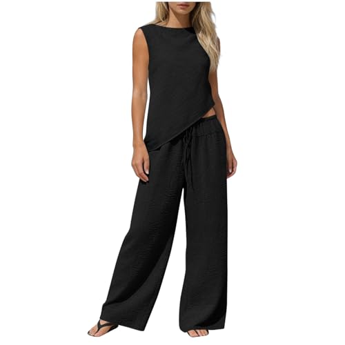 Lounge Sets for Women 2 Piece Summer Outfits Sleeveless Loose Top Wide Leg Drawstring Pants Beach Vacation Sets
