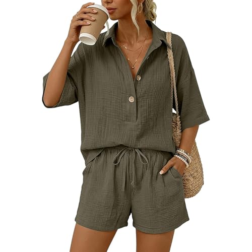 Short Sets for Women 2 Piece Summer Airport Outfits Cotton Linen Lounge Set V Neck T Shirt High Waisted Shorts Matching Set