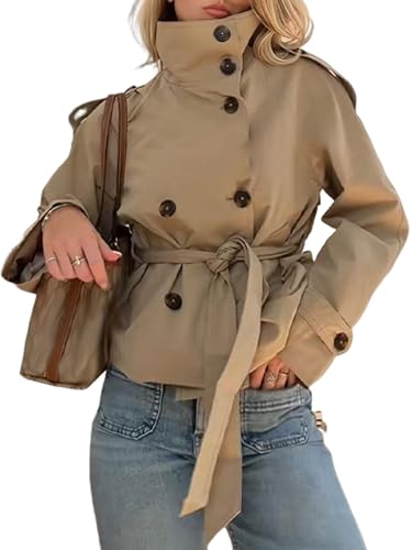 Womens Cropped Trench Coat High Collar Long Sleeve Loose Double Breasted Fashion Fall Winter Coats with Belt