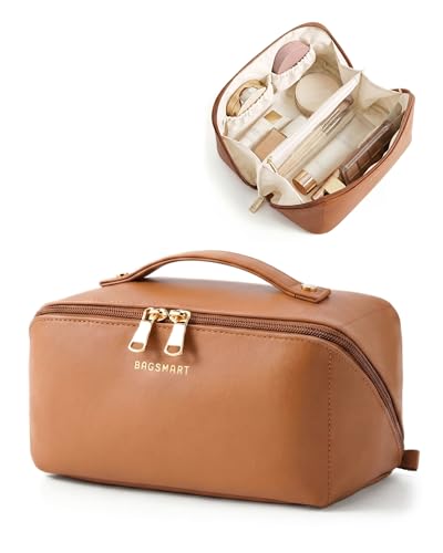 NISHEL Travel Makeup Bag for Women, Fluffy & Lightweight Open Flat Cosmetic Organizer with Multiple Functional Divider for Brush Independent Storage, Handle for Easy Portability, Pink