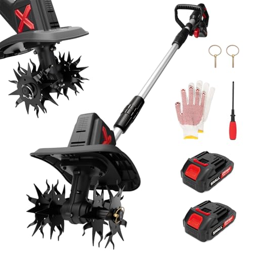 2 in 1 Cordless Tiller and Cultivator with Extension Pole, 20V Lightweight Handheld Battery Tiller Cultivator for Garden Flower Bed Weeding Trenching Battery Included (2 Battery+Rod)