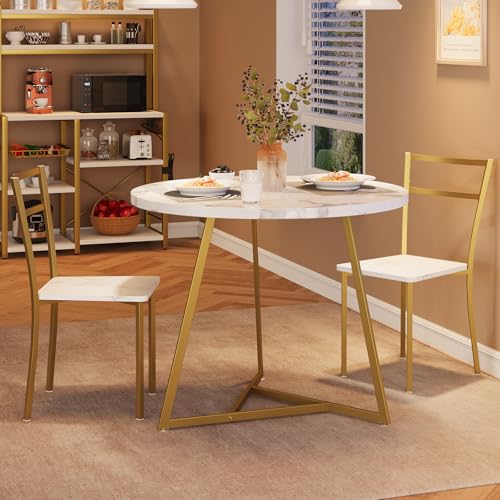 JoanKaren Small Round Dining Table Set for 2, 3-Piece Dinette Set with Faux Marble Top and Upholstered Chairs, Metal Frame, Space-Saving Kitchen Dining Set, Easy Assembly