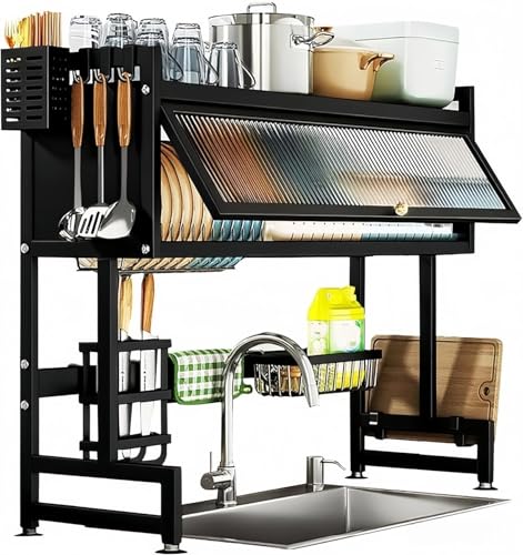 MAJALiS Extendable Dish Drying Rack - Dual Part Dish Racks with Drain Board, Adjustable Large Dish Drainer with Utensil Holder, Spatula Holder and Cutting Board Holder, X-Large 32.5-52 cm, Black