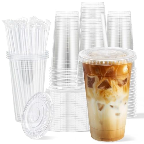 [40 Sets - 20 Oz] Crystal Clear PET Plastic Cups with Dome Lids & Straws for Iced Coffee, Cold Drinks, Milkshake, Slush Cups, Smoothy's, Slurpee, Party's, Plastic Disposable Cups