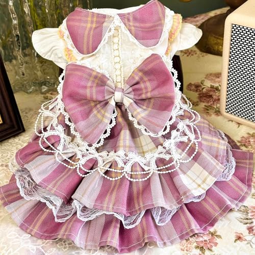 Yymobt Cute Plaid Dog Dress Clothes for Small Dogs Cats Girl Purple Plaid Dog Dress with Pearls Bow Tie Harness Leash for Spring Summer Birthday Puppy Bunny Rabbit Yorkies Chihuahua Outfits