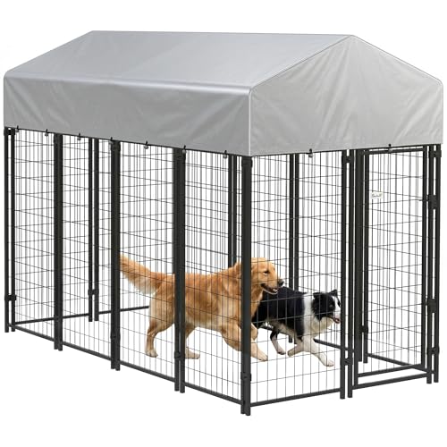 PawHut Outdoor Dog Kennel, Run, Large Wire Steel Fence, Lockable Pet Playpen Enclosure, with Water-, UV-Resistant Canopy Top, Door, Rotating Bowl Holders, 8ft x 4ft x 6ft, Red