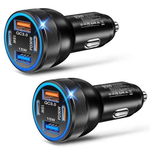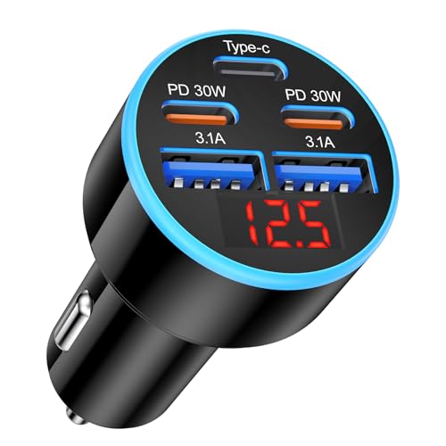 USB C Car Charger, Bangfun 4-Port 65W Super Fast Car Phone Charger Dual 12V USB-C & USB-A Cigarette Lighter Adapter with Voltage Display for iPhone 17 16e 15 Pro Max Plus+5ft Type C Car Charger Cable