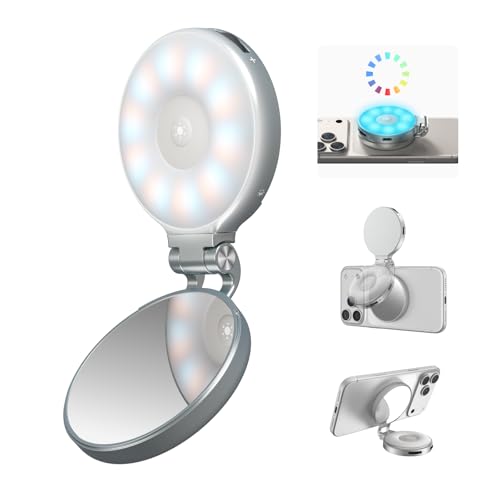K&F CONCEPT Magnetic Phone Selfie Light, 2W 48LEDs 95+ CRI Ring Fill Light, 3000K-6500K Dimmable with Foldable Design & Mirror, 360掳 Rotatable for Selfie Vlog Video Conference Lighting-Black
