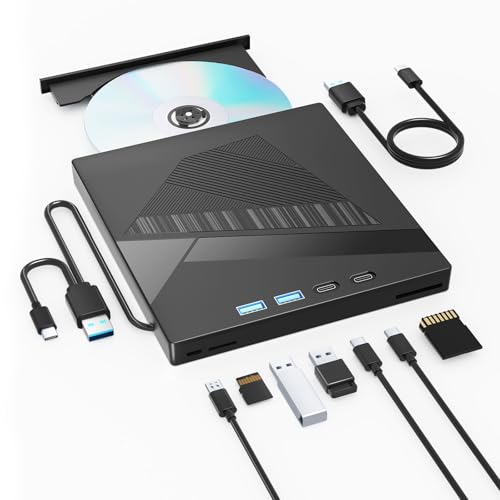 External CD DVD Drive, USB 3.0 CD DVD +/-RW Drive USB C Burner Slim CD/DVD ROM Writer Reader with SD/TF & USB Port, Optical Disk Drive Player for Laptop PC Windows 11/10 Mac MacBook Computer