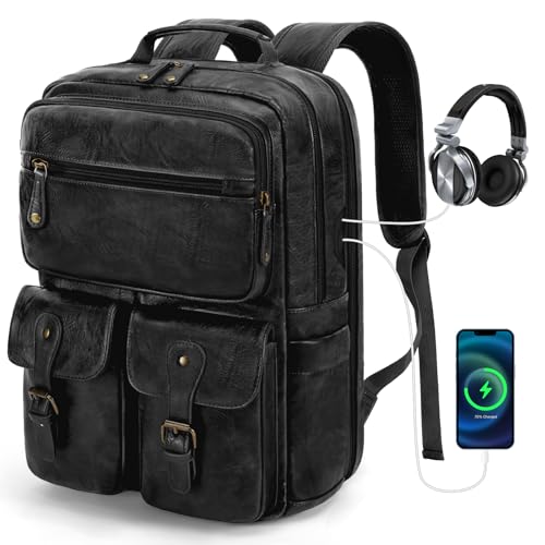 TIDING Men's Leather Expandable Backpack fits 15.6 Inch Laptop, TSA Friendly Business Travel Rucksack Slim Work Casual Daypack