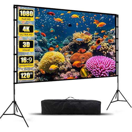 Projector Screen with Stand 120 Inch -Black Backing Outdoor Movie Screen - 25mm Sturdy Aluminum Frame Windproof - 4K HD Portable Foldable Projection Screen for Backyard Camping Home Theater